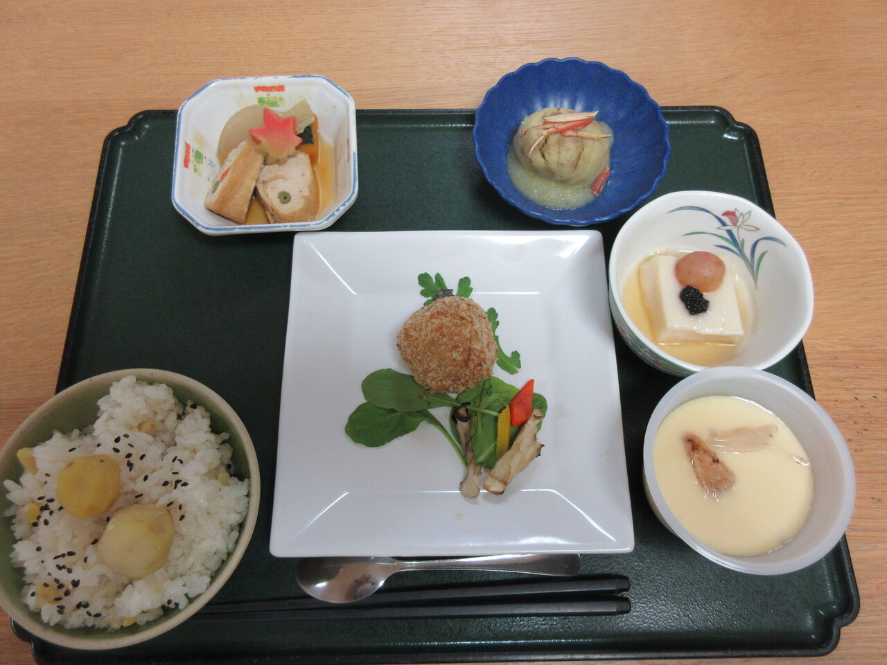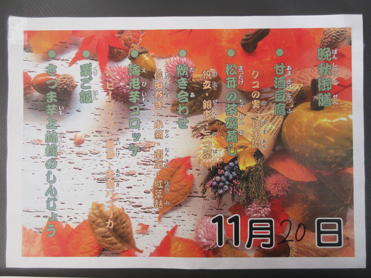 2023年11月23日 11月のご様子 こんにちは。はっぴーらいふ茨木です茨木ではひまわり整骨院の今西さんがリハビリに来られています。居室を訪問し、マッサージなど必要な施術をして頂いております。最近は外出しバラ公園や近くの公園にでかけ歩行訓練をする日を心待ちにされ、大変喜ばれております日中は食堂へ来られ、ゲームやクロスワードパズル、将棋とお好きな事をされ過ごされる利用者さまもいらっしゃり、お茶を飲んだり、みかんを召し上がられたりと自由にお過ごし頂いております11月のハッピーデイの献立は「晩秋御膳」秋を満喫できるお食事は大好評でしたはっぴーらいふ茨木 スタッフブログでした